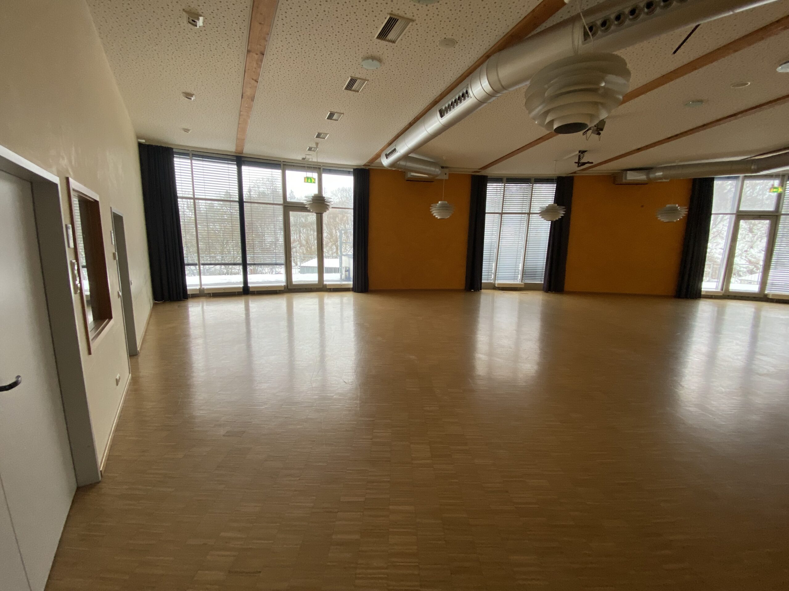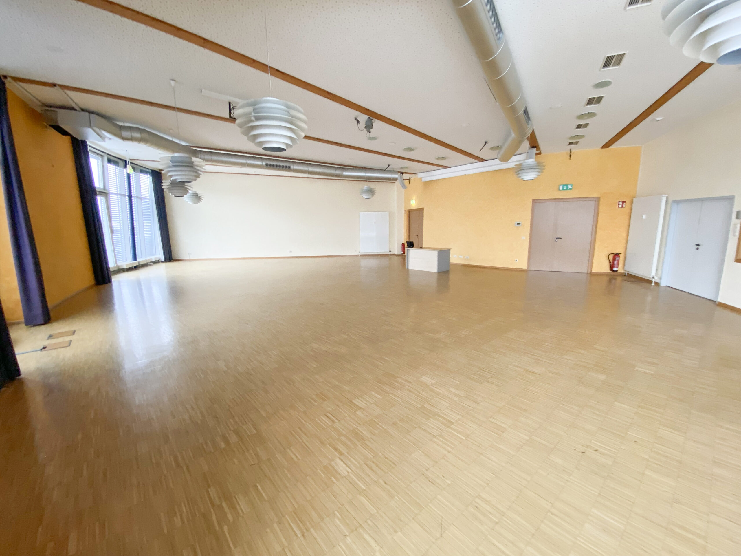 Tageslicht durchflutet den Saal, lässt sich bei Bedarf sanft abdunkeln und schafft gemeinsam mit der steuerbaren Lichttechnik genau die Stimmung, die Ihr Anlass verlangt – konzentriert, feierlich oder inspirierend.