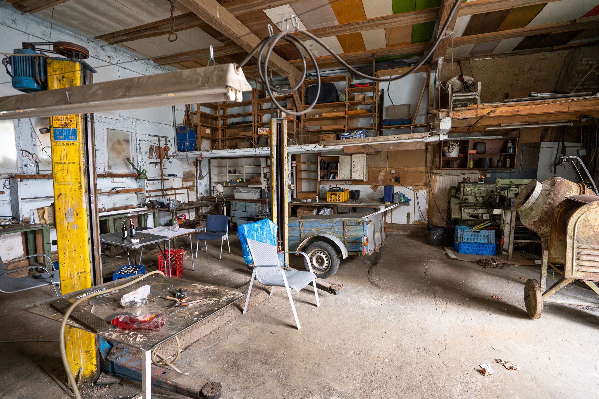 Werkstatt mit Hebebühne, Drehbank und Regalen