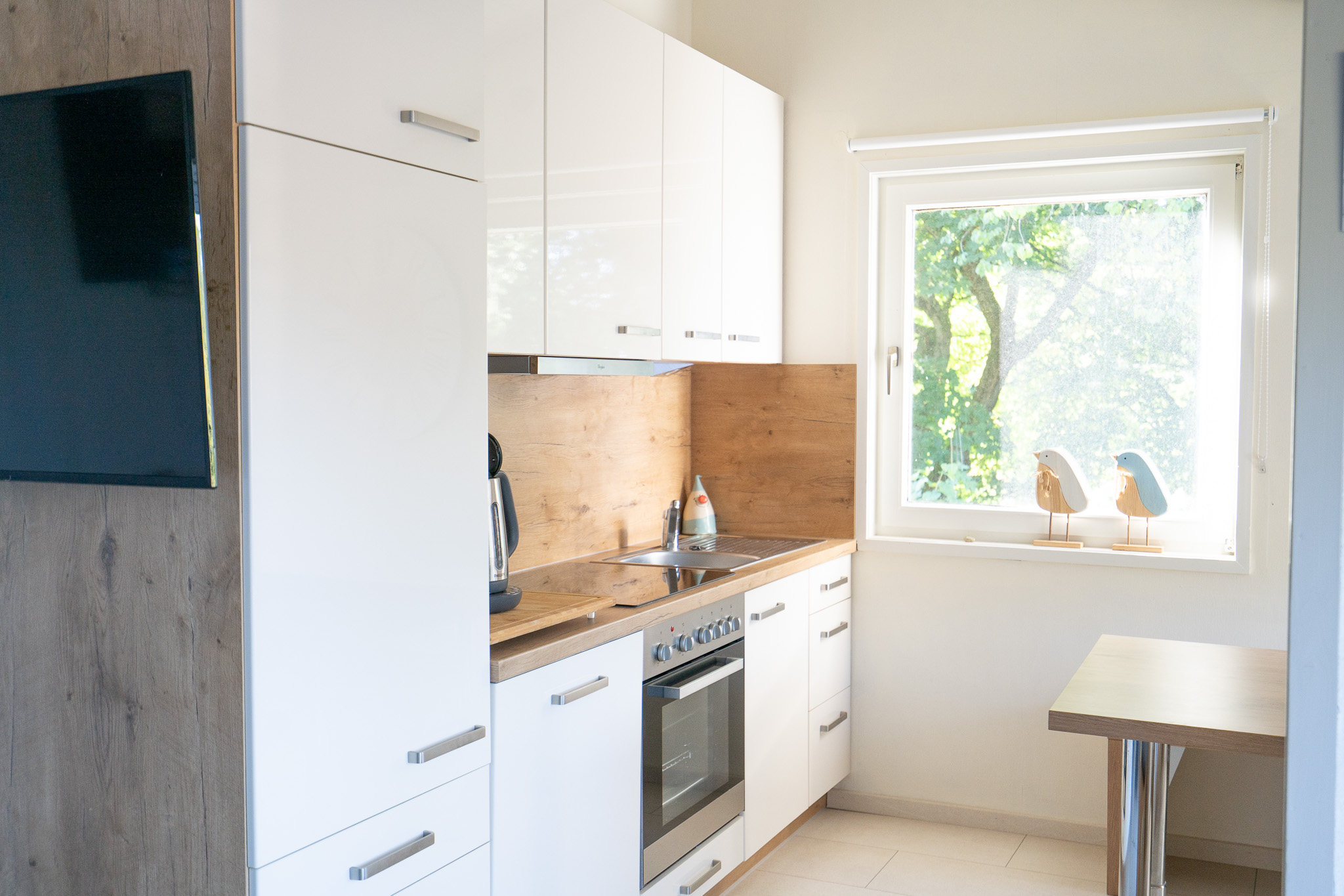 Die moderne Küche ist offen gestaltet und schließt nahtlos an den Essbereich an – perfekt für gemeinsames Kochen und gesellige Mahlzeiten.