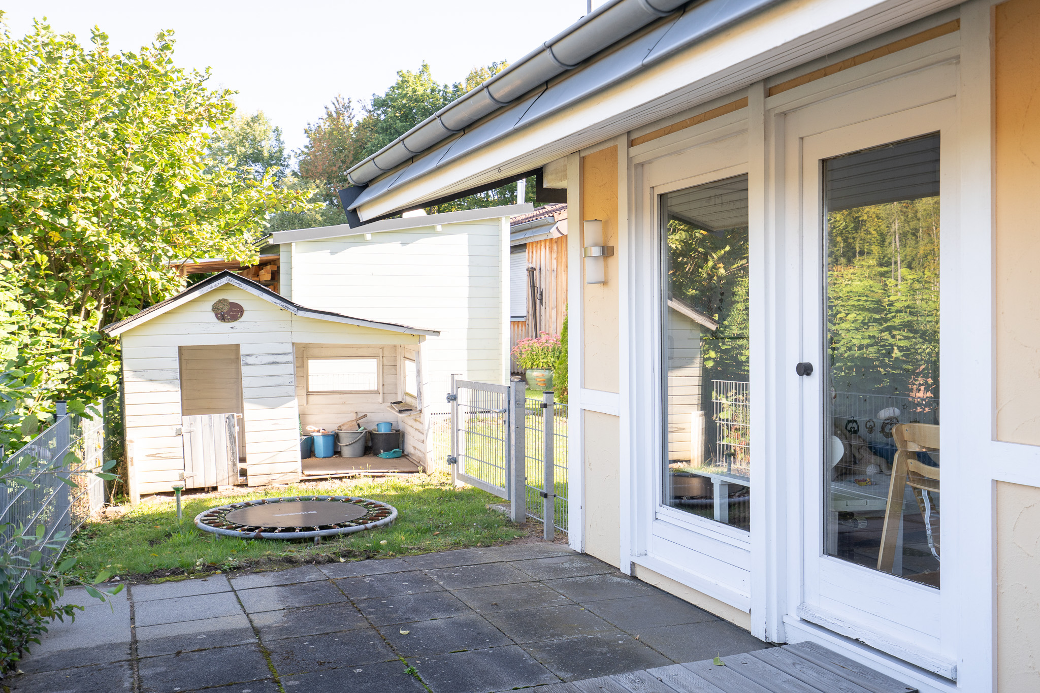 Die gepflegte Terrasse bietet ausreichend Platz für Sitzmöbel und ist der perfekte Ort, um die Sonne zu genießen oder Gäste zu empfangen. Das Grundstück bietet Raum für Freizeit, Gartenideen oder einfach entspannte Stunden unter freiem Himmel.