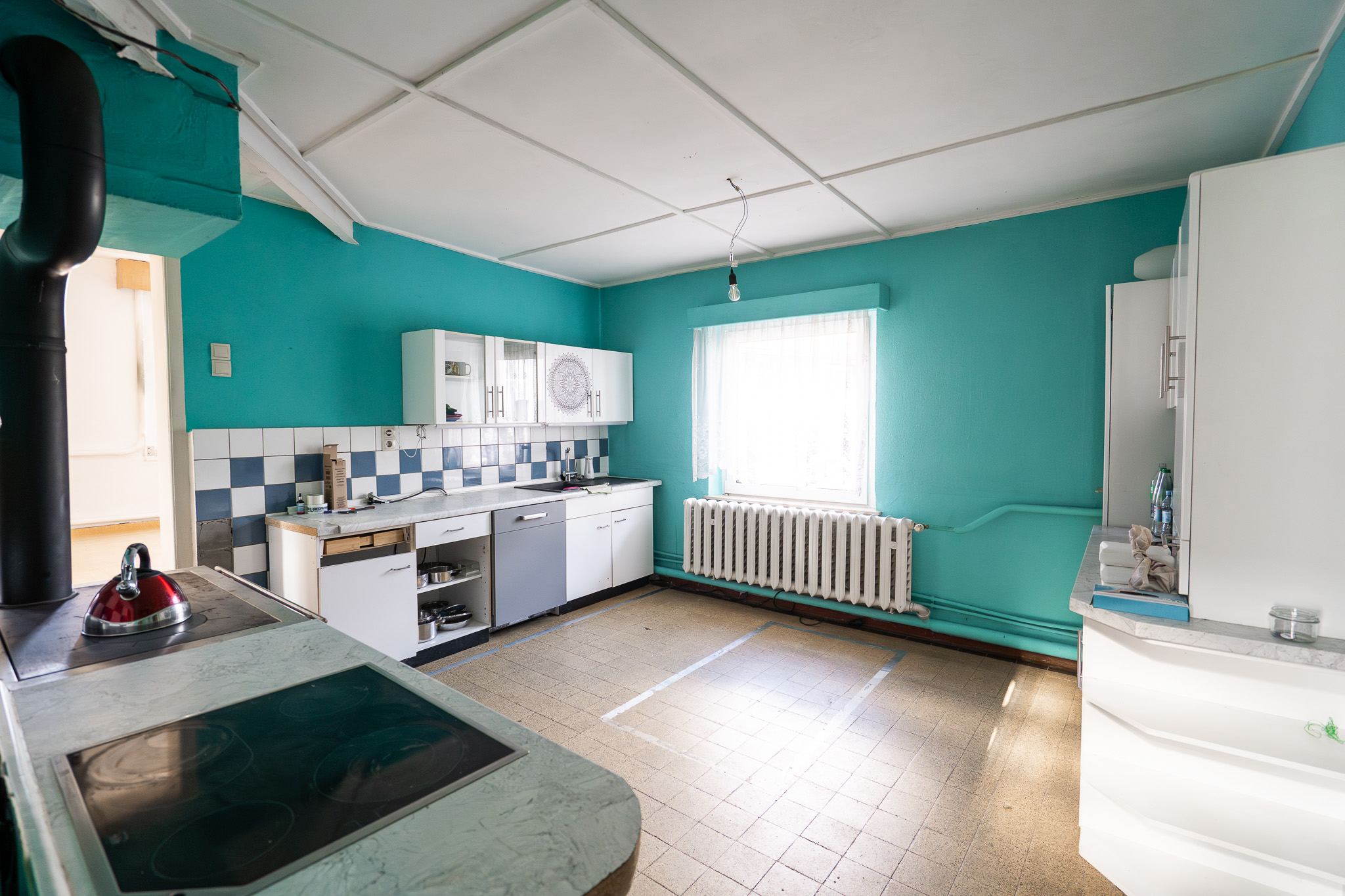 • Küche mit neu installiertem Holzherd – ideal für Liebhaber traditioneller Kochkultur und behaglicher Wärme