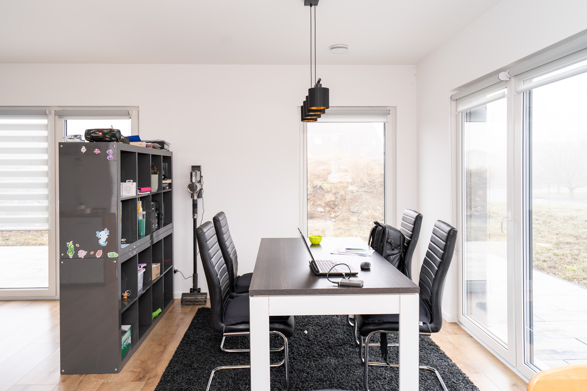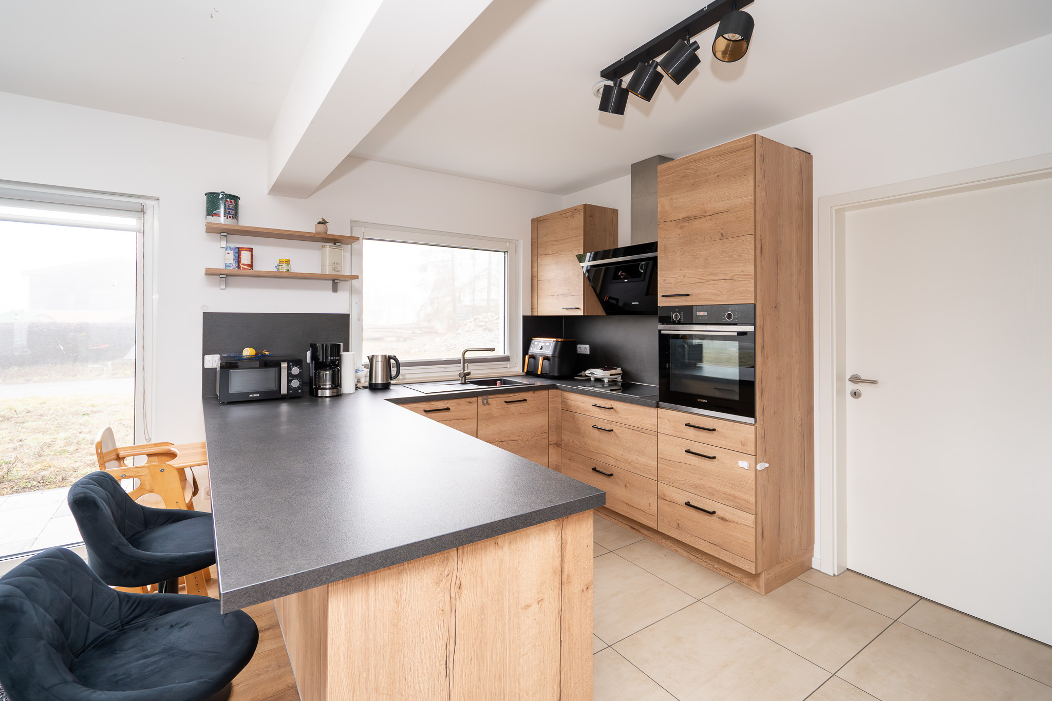Im Erdgeschoss empfängt Sie eine einladende Diele mit Gäste-WC inklusive Dusche. Herzstück des Hauses ist der offen konzipierte Wohn- und Essbereich, der durch zahlreiche Fensterflächen und eine bodentiefe Verglasung mit direktem Terrassenzugang ein helles, freundliches Ambiente erhält. Die stilvoll integrierte Einbauküche mit modernen Elektrogeräten fügt sich harmonisch in den Grundriss ein und kann für 8.500 € übernommen werden. Direkt angrenzend befindet sich der Hauswirtschaftsraum mit Platz für Vorräte, Waschmaschine sowie der zentralen Haustechnik – bestehend aus Lüftungsanlage und Gastherme.