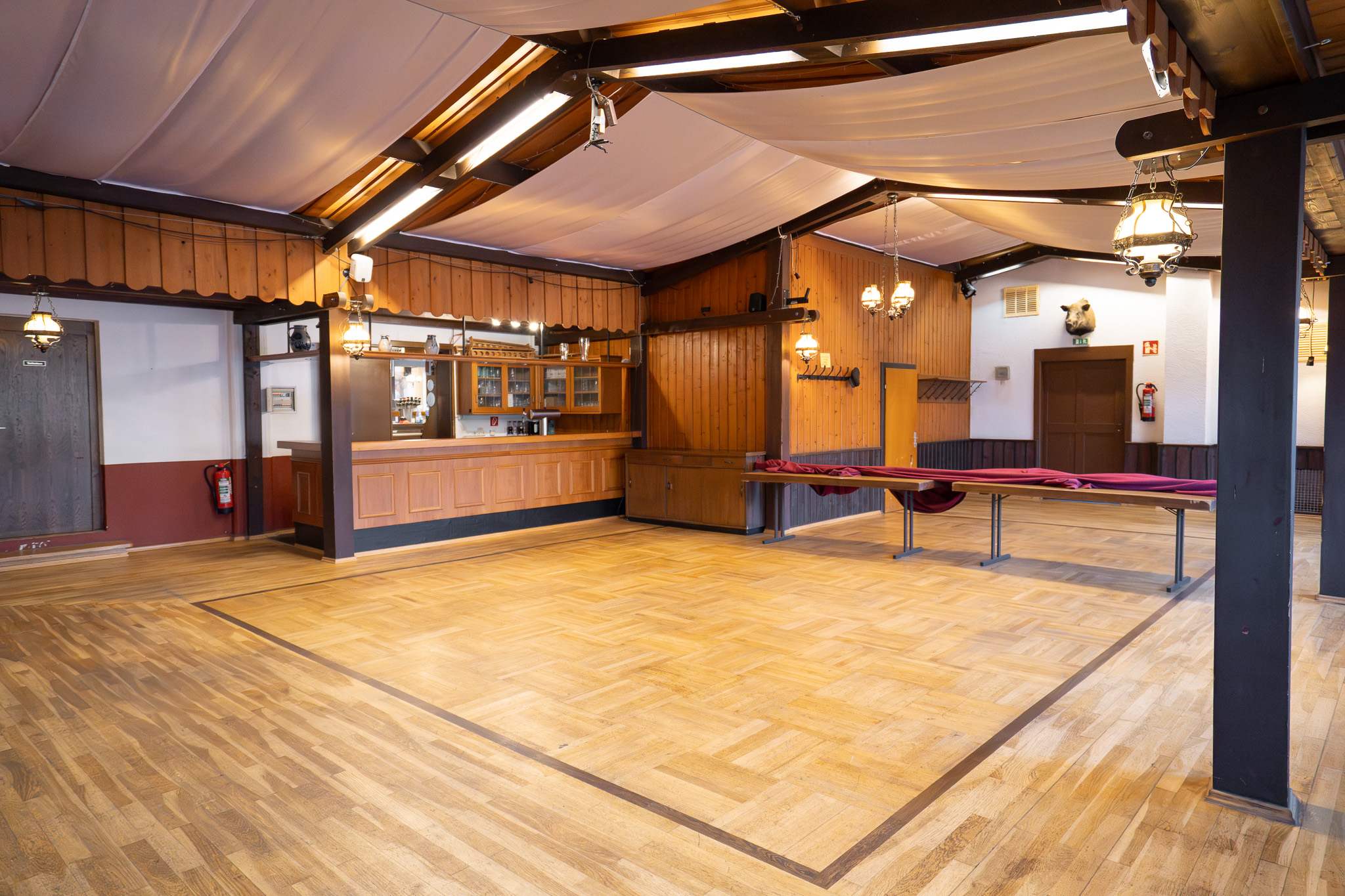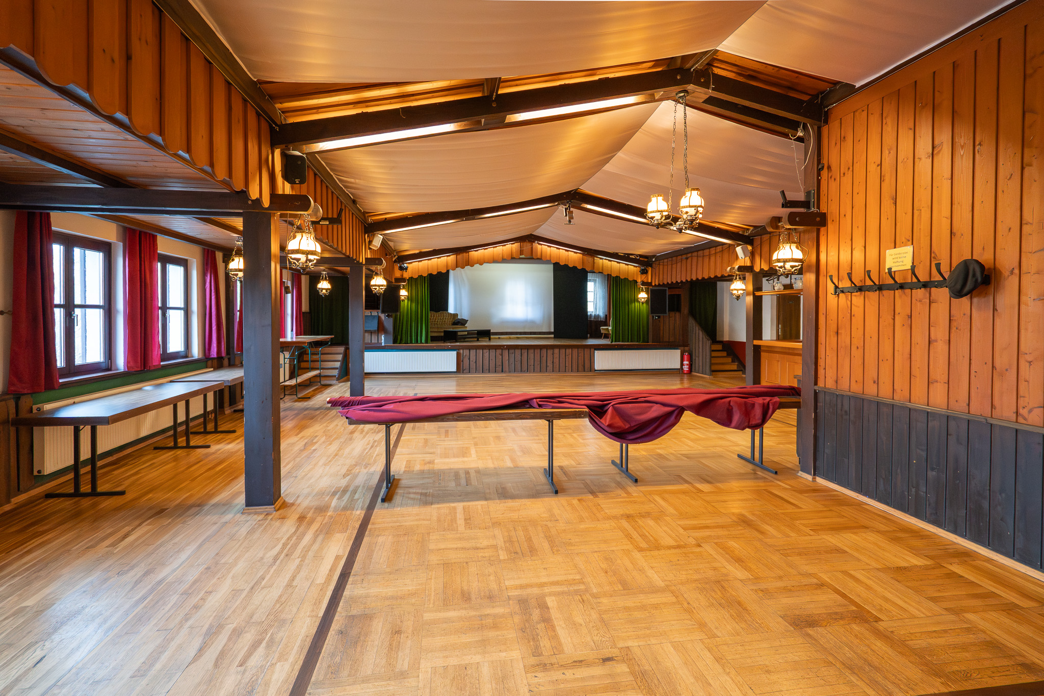 Ein besonderes Highlight der Immobilie ist der direkt angrenzende Veranstaltungssaal mit ca. 190 m² Fläche. Der Saal verfügt über eine Bühne sowie einen eigenen Thekenbereich und bietet damit hervorragende Möglichkeiten für Familienfeiern, Hochzeiten, Vereinsveranstaltungen oder kulturelle Events. Die großzügige Fläche ermöglicht flexible Bestuhlungsvarianten und schafft Raum für Veranstaltungen unterschiedlichster Art.