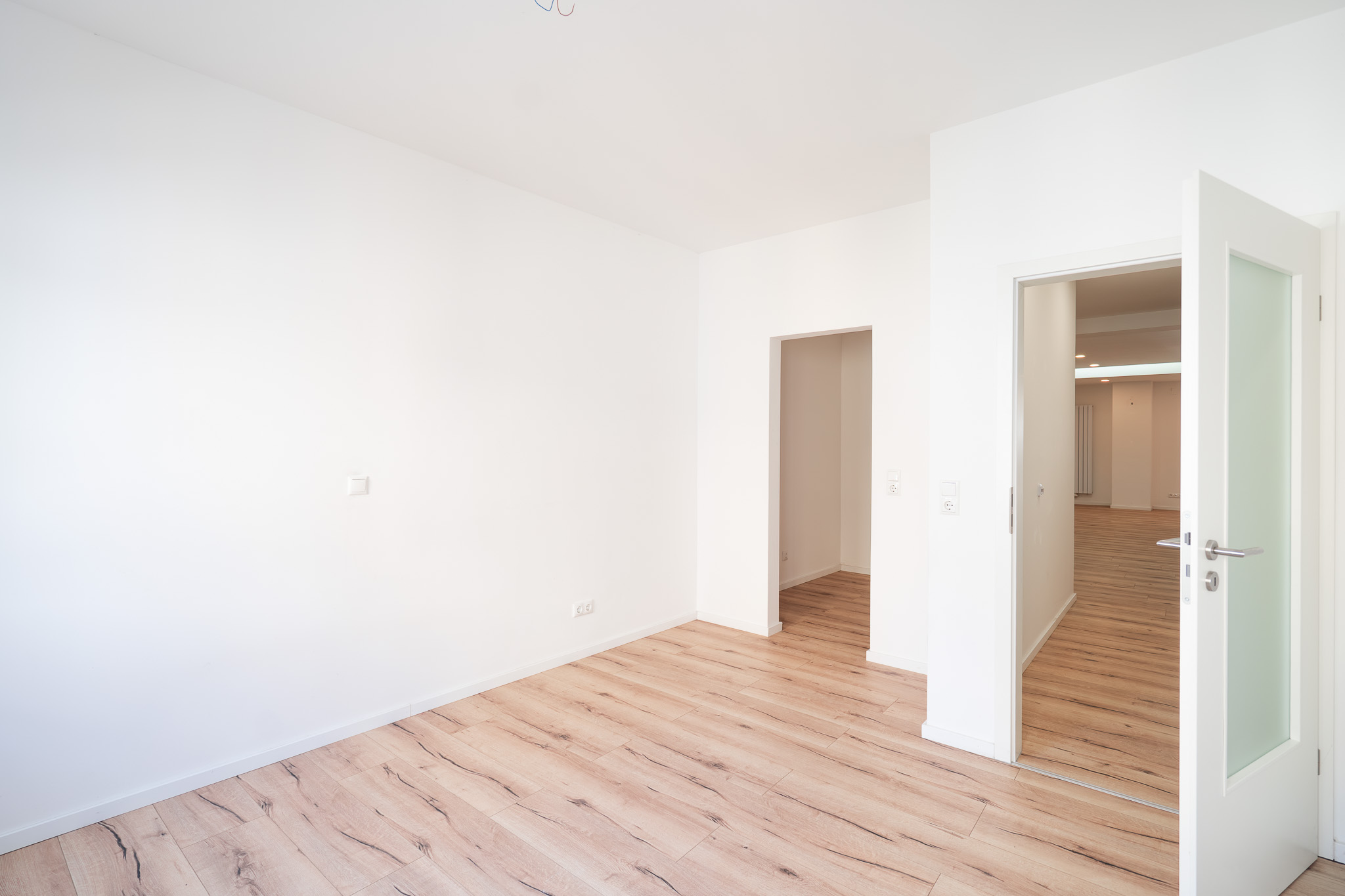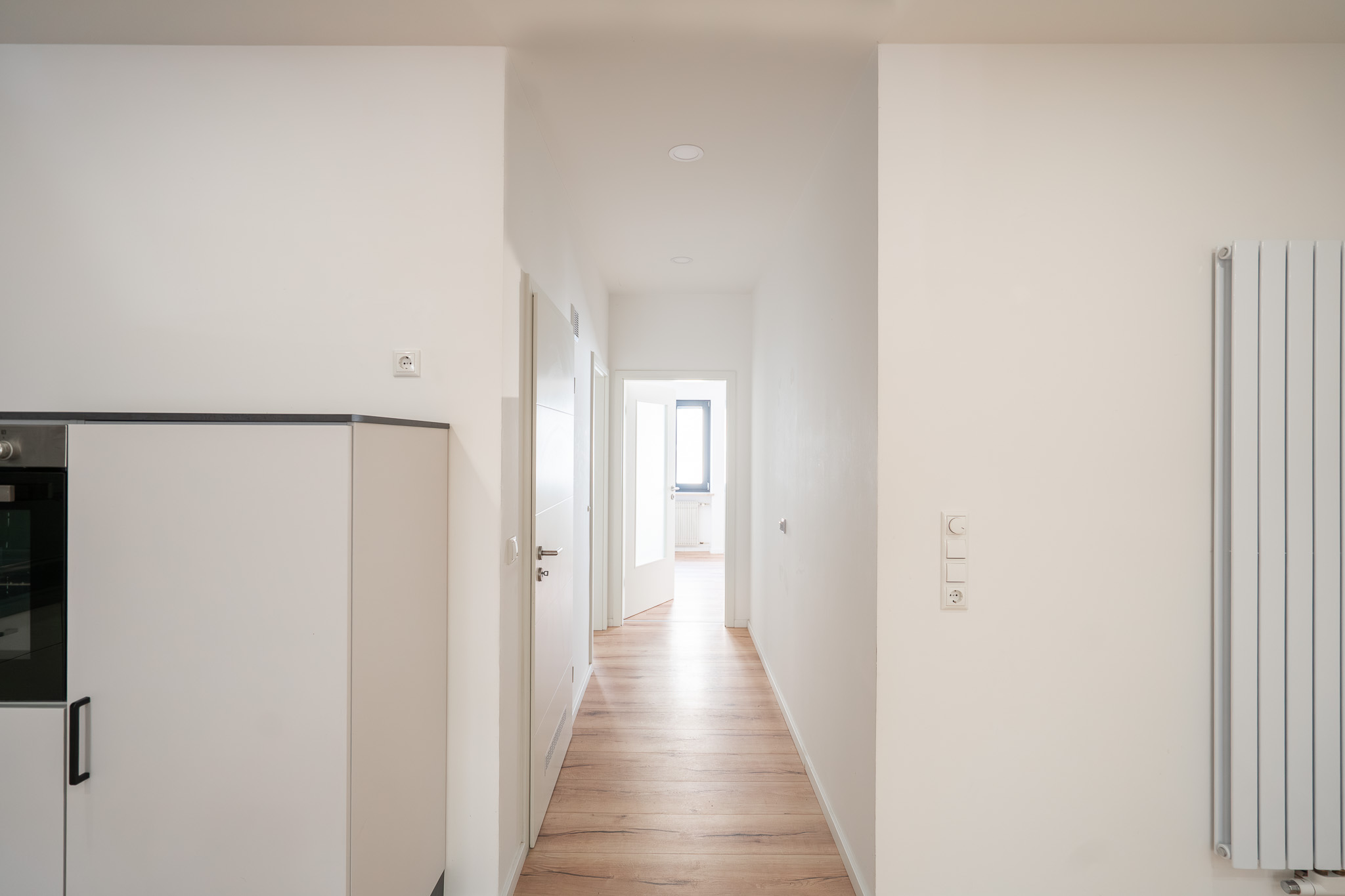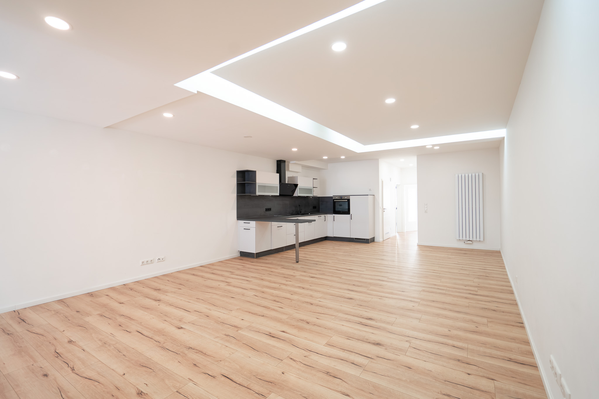 Im ersten Stock angekommen, eröffnet Ihnen die Wohnung einen tollen Blick in ein großes Zimmer mit einem offenen Wohnbereich.